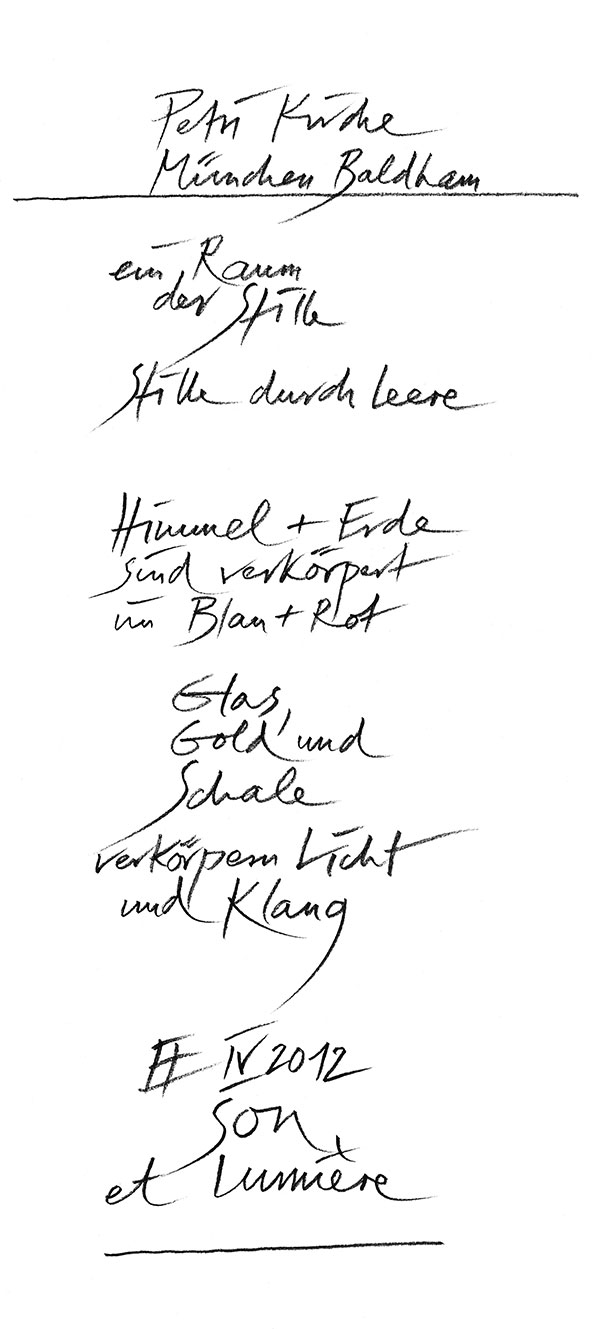 Vor der mittleren Scheibe erheben sich deckenhoch drei Prismen – ein mächtiges Symbol der Trinität. Sie bilden ihrerseits ein Dreieck, vorne zwei gläserne in blau und rot, dahinter, in ihrer Mitte, eines aus vergoldetem Edelstahl, das in Deutsch und Griechisch mit den Schriftworten versehen ist: „So schaue darauf, dass das Licht in Dir nicht Finsternis sei.“ (Lk 11,35) Um sie zu lesen, muss man sich bemühen und nah herantreten. „Die Säulen sind vielschichtige Werkzeuge materieller und geistiger Art: Die goldene Lichtsäule ist zugleich statische Stütze des darüber liegenden Kirchenraums. Die blaue und die rote Säule sind bei nicht-fokussierender Betrachtung geeignet, den Betrachter in eine sich überlagernde Farb-Wahrnehmung einzustimmen – Einführung in einen meditativen Zustand.“ (Florian Lechner) Vervollständigt wird Florian Lechners künstlerische Gestaltung des Raumes durch eine transparente Glasschale mit einem schmalen blauen Kreuz. Sie steht auf einem in den Boden eingelassenen Kreis aus Granit, der sich im Freien fortsetzt, Innen- und Außenraum verbindet, und von den Granitstufen des Amphitheaters als einladende Geste im selben Material aufgenommen wird. (Anja Dollinger)