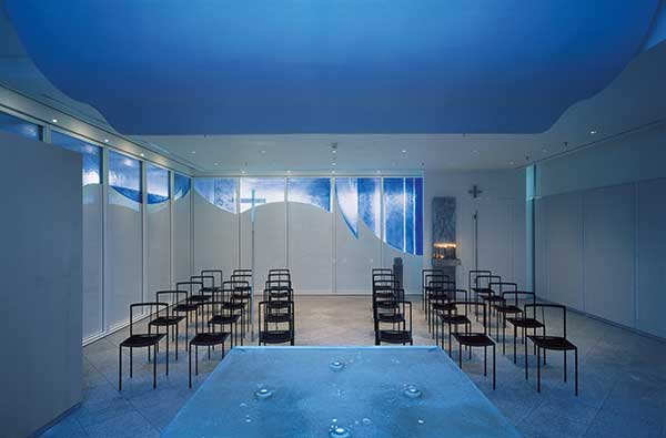 Die Gestaltung der Farbe und Transparenz, der „Dichte“ und Intensität der Glasscheiben, die Führung des Lichtes folgen dieser Bewegung. Am Eingang zum Andachtsraum hat das Glas die größte Dichte: eine Chance für Geborgenheit im wirren Treiben eines Flughafens. Dann öffnet sich das Licht, das Blau geht in ein Türkis über und klingt aus in fast farblosen Gläsern. Der Betrachter erfährt somit eine Veränderung, in gewissem Sinne sogar eine Störung des architektonischen Rasters. […] Doch nur für kurze Zeit: So, wie die Linie Stahl-Glas aus der Architektur aufgenommen wurde, fließt sie auch wieder in sie zurück.“