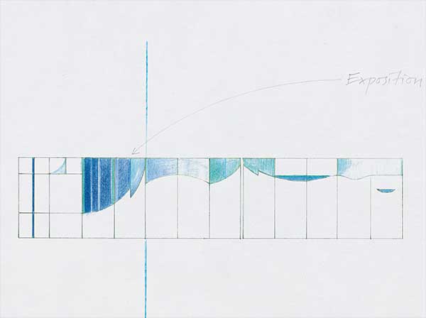 Die Bewegung der Grenzlinie weist damit beiden Teilen Form und Bedeutung zu. Diese Linie wurde direkt von der strengen horizontalen Linienführung am Gebäude aufgenommen und in Schwingung versetzt […]. Nach einer starken Aufwärtsbewegung, hier noch in tiefblauem Glas, erscheint der erste Einschnitt. Er ist die „Eins“ in der Bewegung des Dirigierens nach dem Aufschwung und bereitet den höchsten Punkt vor, in welchem sich die Linie