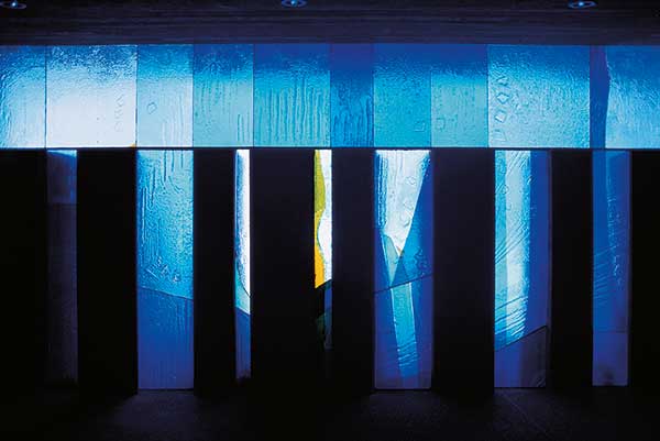 Kontrastierend zu der kühle Strenge ausstrahlenden Anmutung von Beton und Stahl setzt Lechner seine Schmelzgläser ein. An der Außenseite treten sie als blaue Flächen in Erscheinung, die zwischen kräftigen Betonpfeilern im Sockelbereich der hohen