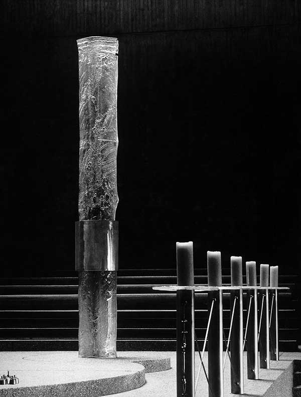 Bereiche der Liturgie hervor, in der Mitte der Ort der Messfeier mit Altar und Tabernakel, vor der Rückwand der Ambo als Ort der Verkündigung und, etwas abgerückt, der Taufbezirk; sie werden durch drei große zylindrische, von der Decke in den Raum ragende Lichtschächte erhellt. Neben Beton bestimmt ein weiterer moderner Werkstoff den Charakter des Raumes, Chrom-Nickelstahl. Für den Fuß des Altars, den Ambo, die Altarschranken mit Kerzenleuchtern, selbst die Weihwasserbecken hat Florian Lechner dieses Material verwendet.
