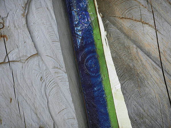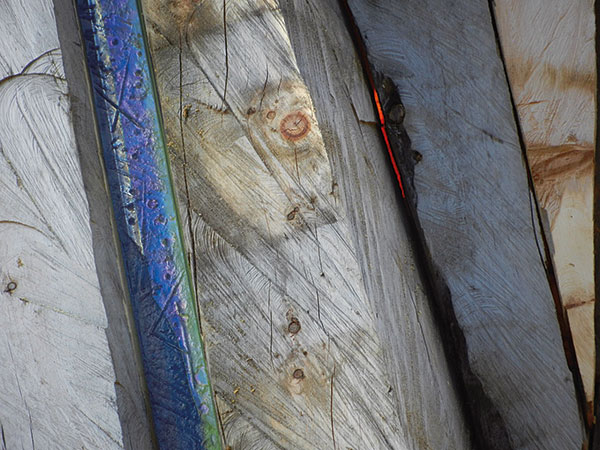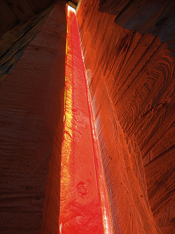 Florian Lechner lässt in dieser archaischen Bergwelt mit seinen farbigen Gläsern ganz vorsichtig eine andere Dimension aufscheinen: Licht, das durch Ritzen zwischen den Brettern in den Raum fällt, gefiltert durch zwei nur acht Zentimeter breite Glasstreifen, einmal in Rot-, einmal in Blau-Grün-Tönen. Es bedarf nur dieser kleinen Lichter, um den Raum zu verwandeln. Die Struktur der Gläser spricht dieselbe Sprache wie die von Arbeitsspuren durchzogene Oberfläche des Holzes. Ein Zusammenklang gegensätzlicher Materialien, an einem „besonderen Ort, der viel mehr als alle anderen kulturellen Orte einer ist, in dem Kultur sich definiert aus der Verbindung von Gewachsenem, Natürlichem mit dem Künstlichen“. (Florian Lechner)