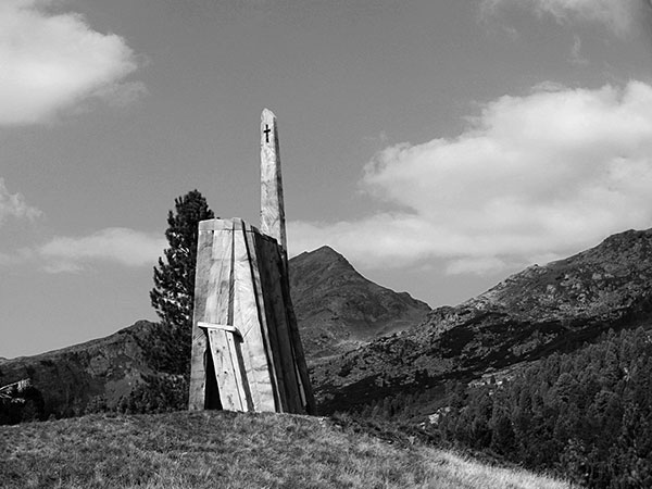 Auf einer Höhe von 2.100 m erhebt sich der aus grob gesägten Brettern gefügte Bau wie ein Felsklotz auf dem kargen Boden. Er wirkt wie ein gewachsener Teil der Landschaft. Das Material ist Zirbenholz, der traditionelle Baustoff der Gegend. Wie dieses Material der Witterung trotzend altert, wie es eine graue Färbung bekommt, kann man an Almhütten und Weidezäunen beobachten.